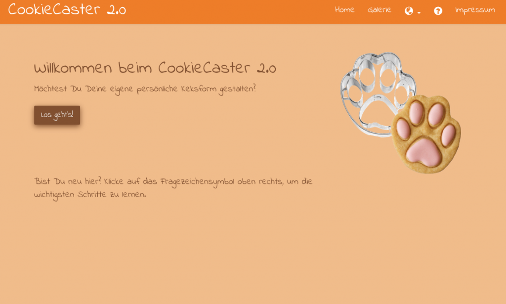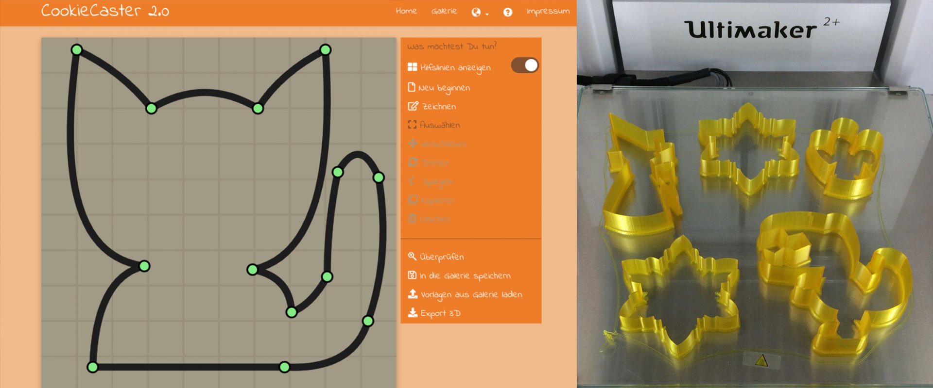 CookieCaster 2.0 ist eine frei verfügbare Webapplikation, die es Benutzerinnen und Benutzern erlaubt, ihre eigenen persönlichen Ausstechformen (Keksform) zu zeichnen, um sie später mittels 3D-Drucker auszudrucken. Eine Validierung der Ausstechform sowie sinnvolle Druckwerte (Wandstärke und -höhe) verhindern, dass die Form für den 3D-Druck ungeeignet oder gar unstabil ist.