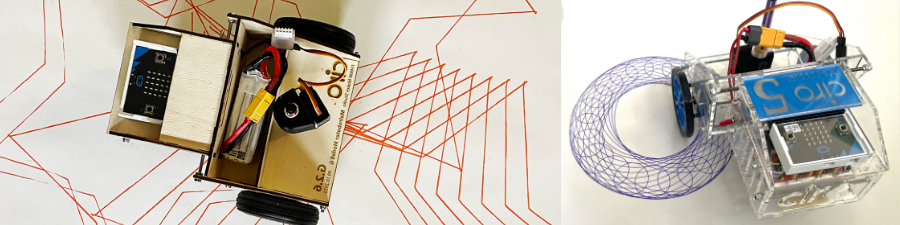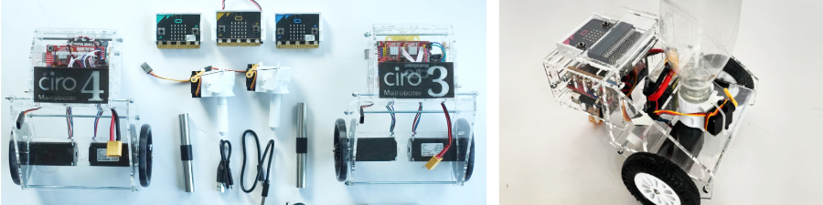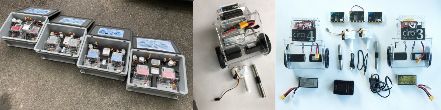 In jeder Box befinden sich zwei komplette ciros mit micro:bit, Verbindungskabel, Akku, Ladegerät, alle nötigen Elemente für das erstellen der Linien auf Papier oder auf dem Pausenplatz. Bis zu 4 Boxen können für den Einsatz in der eigenen Klasse von Lehrkräften ausgeliehen werden.