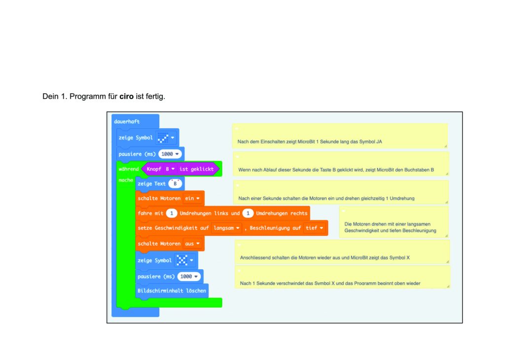 Mit Hilfe der textbasierten Programmierung mit dem Blockeditor von Makecode.Makrobit.org in einem Browser können Lehrpersonen, Schülerinnen und Schüler Symbole, Zeichnungen, Texte entwerfen und vom ciro, dem malenden Roboter auf den Pausenplatz zeichnen lassen.