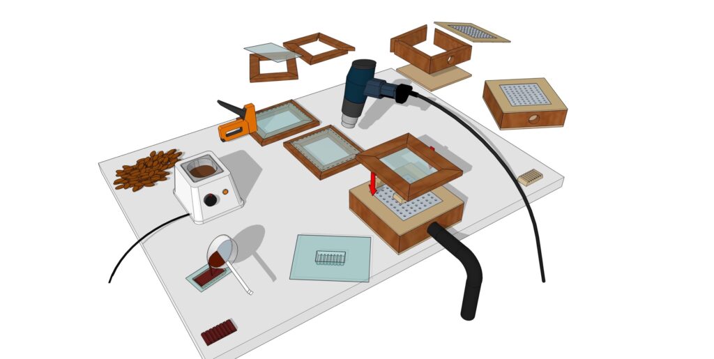Schülerinnen und Schülern der 9. Klasse gibt die Makerbox Inputs für ein eigenes Projekt zum Thema «Produktion einer eigenen Schokoladetafel». Sie können die Geräte und Anleitungen benutzen, um sich in der Phase der Recherche die nötigen Kompetenzen und das fehlende Fachwissen anzueignen.